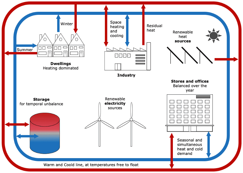 A 5th generation heating and cooling network (5GDHC) is based on the exchange of low-quality, renewable energy between buildings with different needs. The network transports a low-temperature water flow to decentralized substations, which increase the temperature demand to the required level in a controlled manner. Thermal storage bridges the time gaps between supply and demand and prevents electricity demand during peak hours. The concept optimises the proportion of low-grade renewable and residual heat and cold sources.